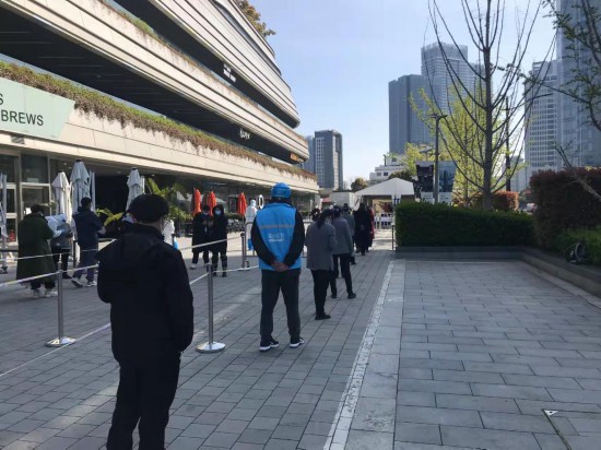 浦東新區(qū)東一居民區(qū),市民在排隊進行核酸檢測。(新華社記者 丁汀攝)
