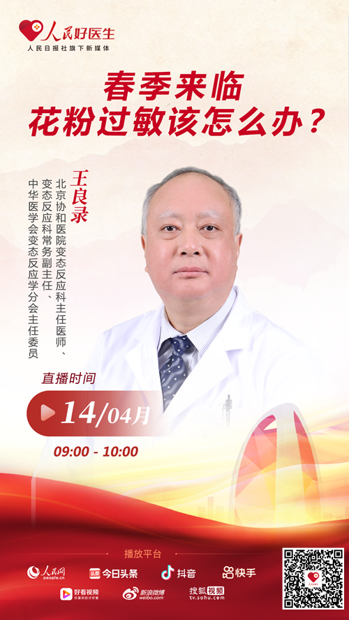 4月14日9:00,北京協和醫院變態反應科主任醫師、變態反應科常務副主任、中華醫學會變態反應學分會主任委員王良錄將做客“人民好醫生”APP直播間,與大家分享相關春季花粉過敏防治科普知識。