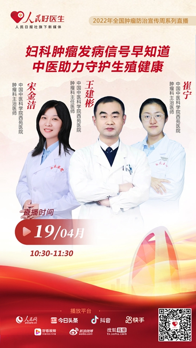 4月19日10:30至11:30,客戶端將邀請(qǐng)到中國(guó)中醫(yī)科學(xué)院西苑醫(yī)院腫瘤科主任醫(yī)師王建彬、中國(guó)中醫(yī)科學(xué)院西苑醫(yī)院腫瘤科主治醫(yī)師宋金潔、中國(guó)中醫(yī)科學(xué)院西苑醫(yī)院腫瘤科主治醫(yī)師崔寧做客直播間,為大家詳細(xì)講解婦科腫瘤防治知識(shí)。