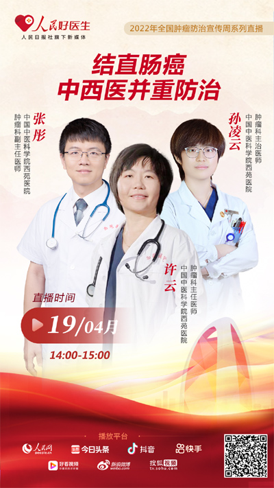 4月19日14:00,中國中醫科學院西苑醫院腫瘤科主任醫師許云、中國中醫科學院西苑醫院腫瘤科副主任醫師張彤、中國中醫科學院西苑醫院腫瘤科主治醫師孫凌云將做客“人民好醫生”健康科普直播間,與大家就結直腸癌中西醫結合防治的相關問題進行分享。