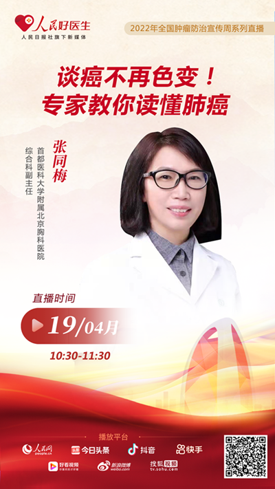 4月19日10:30,首都醫科大學附屬北京胸科醫院綜合科副主任、北京腫瘤防治研究會癌癥早篩早診早治分委會主任委員張同梅將做客“人民好醫生”客戶端直播間,向廣大網友分享肺癌診治相關知識,歡迎屆時收看。