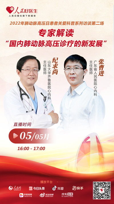 5月5日16:00,廣東省人民醫院心內科主任醫師張曹進、山東大學齊魯醫院心內科主任醫師紀求尚將做客“人民好醫生”客戶端,為大家揭開肺動脈高壓的神秘面紗,解讀國內肺動脈高壓診療的新發展。