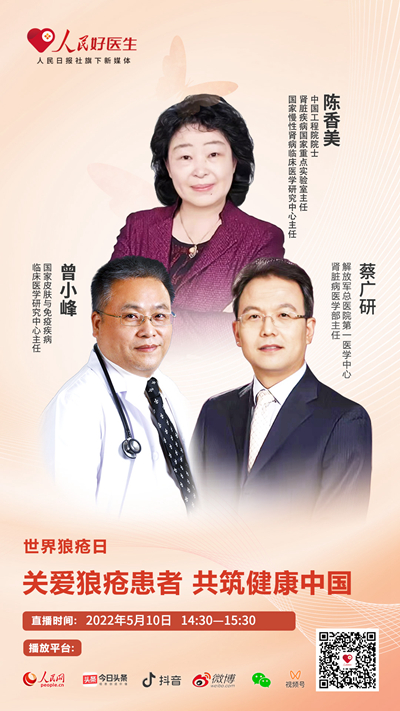 5月10日14:30至15:30,“人民好醫生”客戶端將邀請中國工程院院士、國家慢性腎病臨床醫學研究中心主任、腎臟疾病國家重點實驗室主任、中國醫師協會腎臟內科醫師分會會長陳香美,北京協和醫院風濕免疫科主任、國家皮膚與免疫疾病臨床醫學研究中心主任曾小峰,解放軍總醫院第一醫學中心腎臟病醫學部主任蔡廣研做客“世界狼瘡日”主題節目,與您一起關愛狼瘡患者,共筑健康中國。