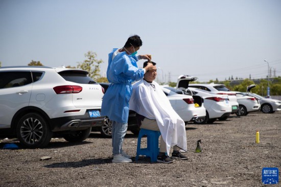 5月4日,在上海浦東北蔡鎮設立的醫護集散點,志愿者幫助工作人員理發。