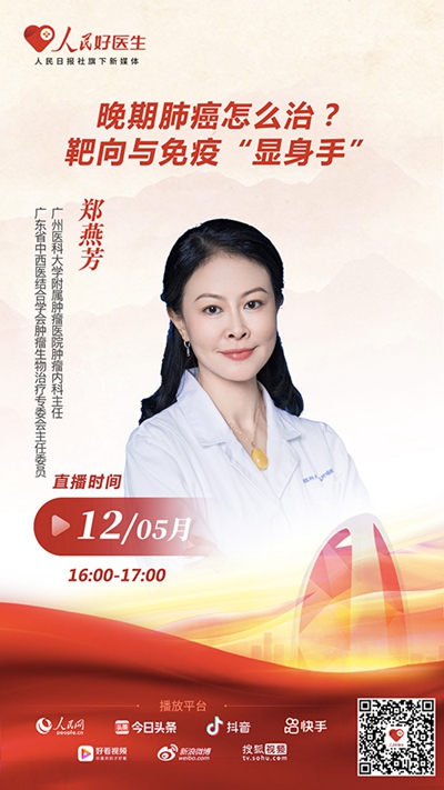 5月12日16:00 ,“人民好醫生”客戶端將邀請廣州醫科大學附屬腫瘤醫院腫瘤內科主任、廣東省中西醫結合學會腫瘤生物治療專委會主任委員鄭燕芳做客直播間,就“晚期肺癌治療”話題與公眾進行分享,歡迎屆時收看。