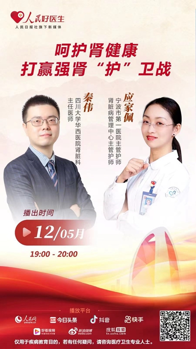 為提高公眾對(duì)腎臟病的認(rèn)知,強(qiáng)調(diào)慢性腎臟病(CKD)長(zhǎng)期規(guī)范管理的重要性,以及科普醫(yī)生、護(hù)士、患者及家屬如何配合做好CKD科學(xué)管理的相關(guān)知識(shí),5月12日19:00,“人民好醫(yī)生”客戶端將邀請(qǐng)四川大學(xué)華西醫(yī)院腎臟科主任醫(yī)師秦偉,寧波市第一醫(yī)院主管護(hù)師、腎臟病管理中心主管醫(yī)師應(yīng)家佩作客直播間,就我國(guó)慢性腎臟病相關(guān)話題進(jìn)行分享,歡迎屆時(shí)收看。
