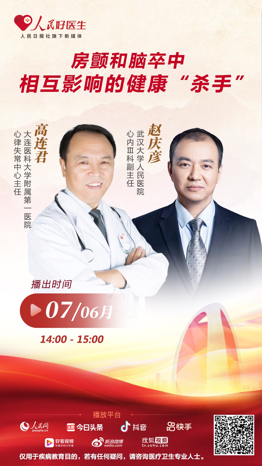 6月7日14:00,大連醫(yī)科大學(xué)附屬第一醫(yī)院心律失常中心主任高連君、武漢大學(xué)人民醫(yī)院心血管內(nèi)科主任醫(yī)師趙慶彥將做客“人民好醫(yī)生”直播間,共同就房顫和腦卒中預(yù)防及治療的相關(guān)內(nèi)容和網(wǎng)友進行分享。