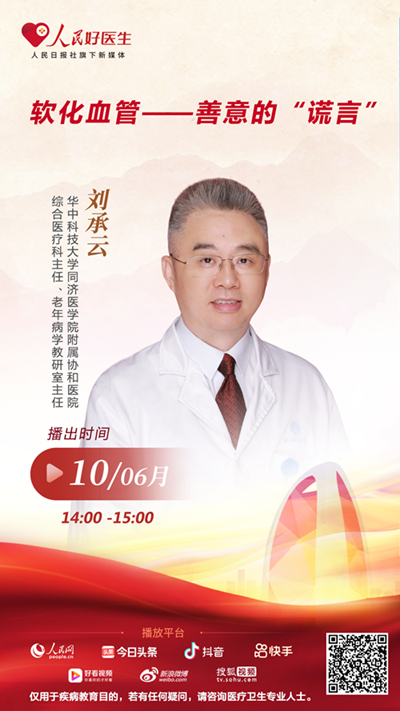 6月10日14:00,華中科技大學同濟醫學院附屬協和醫院綜合醫療科主任、老年病學教研室主任劉承云將做客“人民好醫生”客戶端直播間,和大家分享血管老化的相關知識,教大家保持血管年輕態的秘訣,歡迎屆時收看。