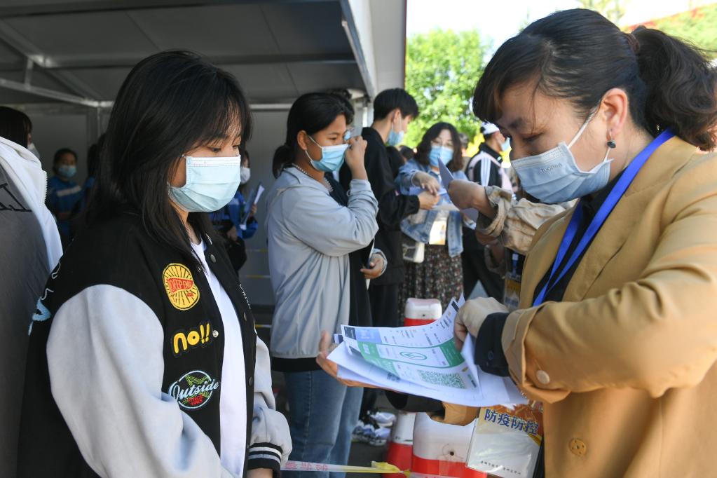 6月7日,在內蒙古赤峰市松山區第四中學考點,工作人員在檢查考生健康碼及核酸檢測報告。(新華社記者 貝赫 攝)