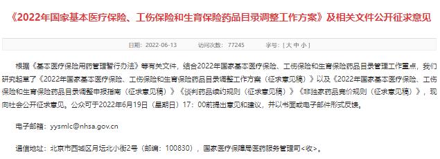 《2022年國(guó)家基本醫(yī)療保險(xiǎn)、工傷保險(xiǎn)和生育保險(xiǎn)藥品目錄調(diào)整工作方案》公開(kāi)征求意見(jiàn)