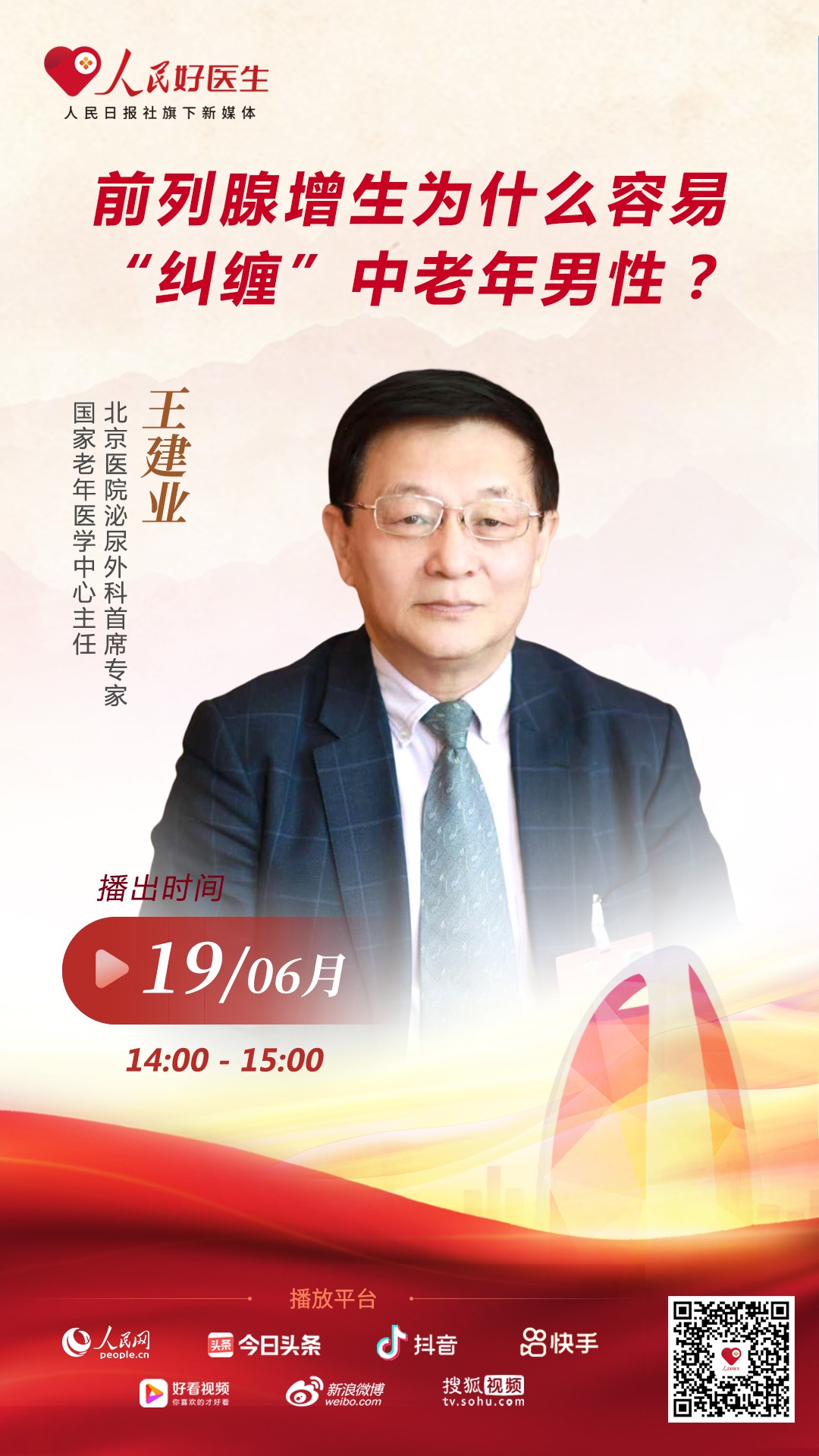 6月19日14:00,北京醫(yī)院泌尿外科首席專家、國家老年醫(yī)學中心主任王建業(yè)將做客“人民好醫(yī)生”客戶端,就前列腺增生相關話題與大家進行分享。