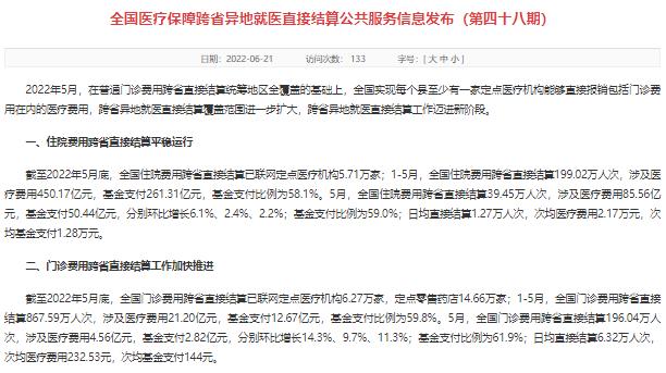 聚焦1.25億跨省流動人口的就醫結算需求,深入推進醫保領域“放管服”改革,2021年以來,國家醫保局會同有關部門鞏固拓展住院費用跨省直接結算成果,全面推動門診費用跨省直接結算工作。截至2022年5月底,全國住院費用跨省直接結算已聯網定點醫療機構5.71萬家;1-5月,全國住院費用跨省直接結算199.02萬人次,涉及醫療費用450.17億元,基金支付261.31億元,基金支付比例為58.1%。截至2022年5月底,全國門診費用跨省直接結算已聯網定點醫療機構6.27萬家,定點零售藥店14.66萬家;1-5月,全國門診費用跨省直接結算867.59萬人次,涉及醫療費用21.20億元,基金支付12.67億元,基金支付比例為59.8%。