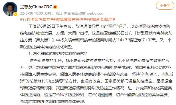 人民網北京6月30日電 (記者喬業瓊)工信部6月29日下午宣布,取消通信行程卡的“星號”標記,以支撐高效統籌疫情防控和經濟社會發展、方便廣大用戶出行。這是繼衛健委28日公布《新型冠狀病毒肺炎防控方案(第九版)》中將入境者和密接者的隔離時間從“14+7”縮短為“7+3”天,又一個新冠防控具體措施的優化調整。對此,中國疾控中心流行病學首席專家吳尊友今日上午在其微博上表示,這符合科學防控原則,符合我國國情,切合當前新冠防控的實際需要,是精準實施防控策略措施的具體表現。
