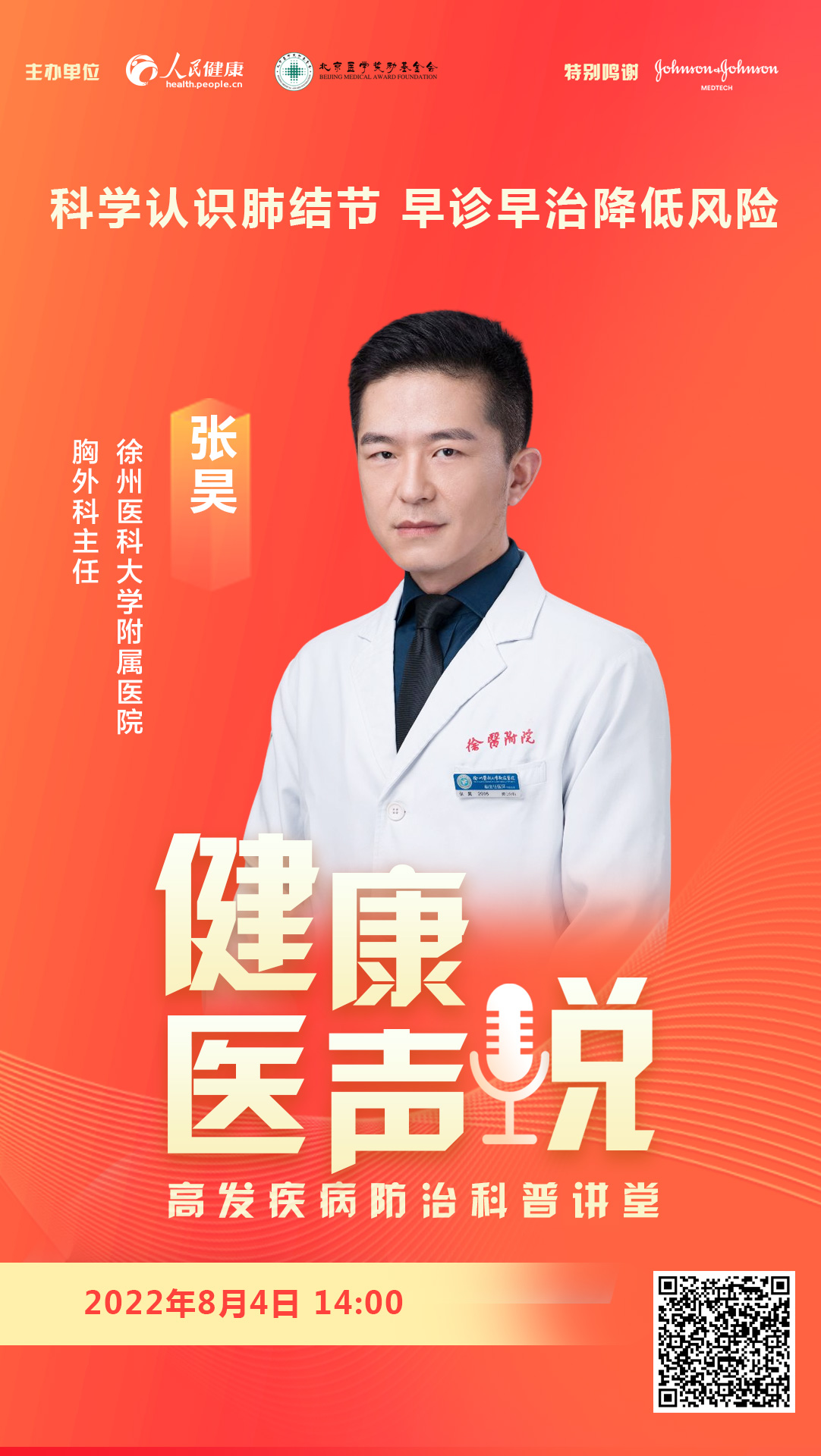 8月4日14:00,徐州醫科大學附屬醫院胸外科主任張昊將做客直播間,就肺結節的相關問題與網友進行分享。