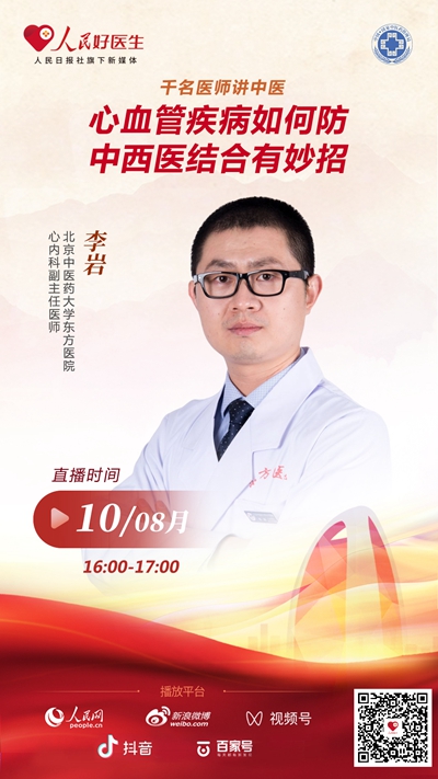 8月10日16:00-17:00,“人民好醫(yī)生”與國家中醫(yī)藥管理局辦公室聯(lián)合推出的“千名醫(yī)師講中醫(yī)”系列直播將邀請北京中醫(yī)藥大學(xué)東方醫(yī)院心內(nèi)科副主任醫(yī)師李巖做客直播間,為大家講解心血管疾病防治相關(guān)知識,千萬不要錯過。