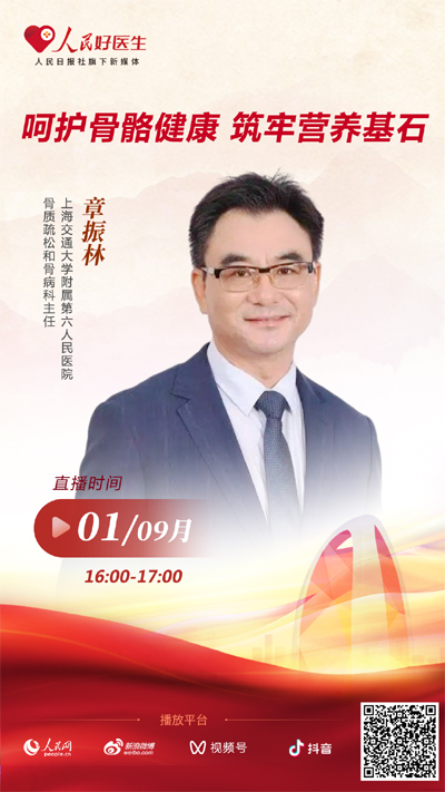 9月1日16:00,上海交通大學附屬第六人民醫院骨質疏松和骨病科主任章振林將做客“人民好醫生”直播間,就骨質疏松等相關內容和網友進行分享。