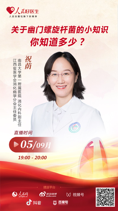 9月5日19:00,南昌大學第一附屬醫院消化內科副主任、江西省醫學會消化病學分會主任委員祝蔭將做客“人民好醫生”客戶端,和大家聊一聊幽門螺旋桿菌的相關知識。