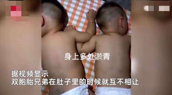上述視頻來自一位湖南寶媽。視頻中,雙胞胎兄弟似乎在母親肚子里“拳打腳踢”,母親的孕肚也跟著起伏變化,而這對雙胞胎出生后身上就到處是淤青。