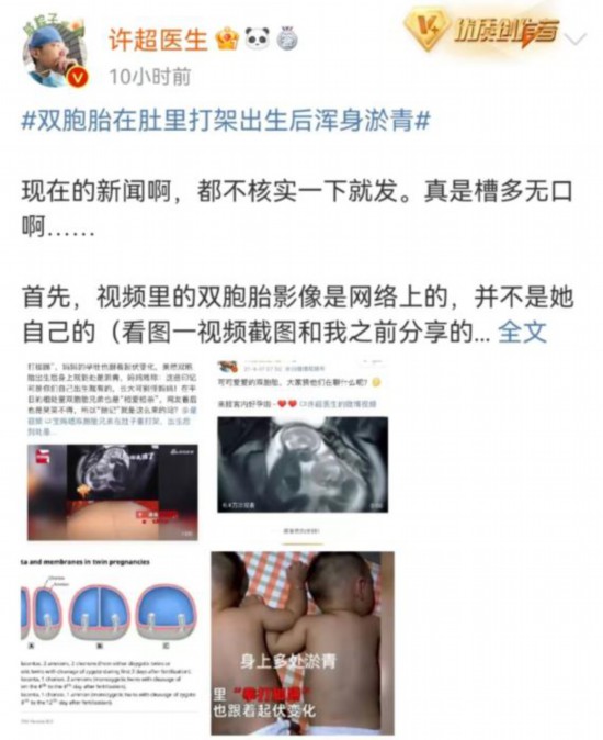 微博名為“許超醫生”的健康博主也在微博上用“槽多無口”來形容這則消息。他表示,雙胞胎在子宮里的動作基本都是無意識的,伸手伸腳并不是在打架,而且隔著羊膜囊又有羊水的緩沖,幾乎不會給對方造成“傷害”。