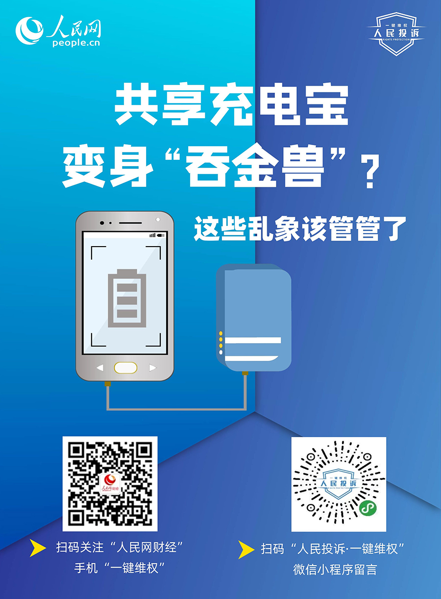 價格貴、歸還難、服務差,共享充電寶相關問題在一定程度上影響了消費體驗,損害了消費者的利益。 人民網“人民投訴”平臺即日起征集相關維權線索,如果您遭遇此類權益侵害,或了解相關領域某些欺詐行為中不為人知的陷阱、黑幕,歡迎您掃碼關注“人民網財經”微信公眾號或掃描“人民投訴·一鍵維權”微信小程序留言、投訴、曝光。屆時我們還將邀請中消協相關領域權威專家做客“消費洞察”欄目,針對網友的熱點留言投訴答疑解惑,敬請期待。