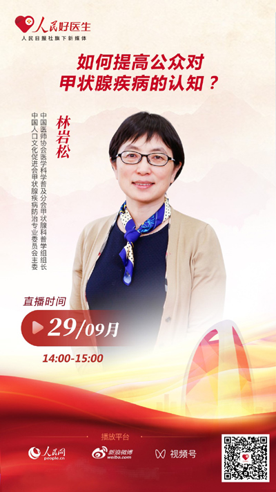 9月29日14:00,中國醫師協會醫學科學普及分會甲狀腺科普學組組長、中國人口文化促進會甲狀腺疾病防治專業委員會主委林巖松將做客“人民好醫生”客戶端名醫直播間,圍繞“如何提高公眾對甲狀腺疾病的認知”進行分享。