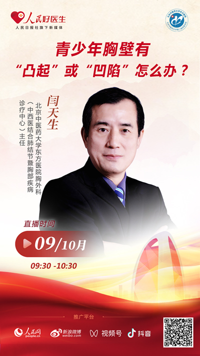 10月9日9:30,北京中醫藥大學東方醫院胸外科(中西醫結合肺結節暨胸部疾病診療中心)主任閆天生將做客人民日報社旗下新媒體平臺“人民好醫生”客戶端直播間,向廣大網友分享胸壁畸形相關知識。