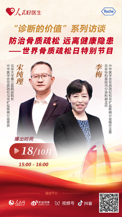10月20日是世界骨質疏松日。作為一種常見骨骼疾病,骨質疏松在悄無聲息中破壞著我們的骨骼健康,帶來包括骨折在內的一系列疾病風險。那么,哪些人群需要關注骨質疏松,骨質疏松該如何有效防治,骨骼健康水平又該如何定期評估?10月18日15:00,“診斷的價值”系列訪談之“防治骨質疏松 遠離健康隱患——世界骨質疏松日特別節目”,特別邀請到北京大學第三醫院副院長、中華醫學會骨質疏松與骨礦鹽疾病分會委員宋純理,北京協和醫院內分泌科副主任、中華醫學會骨質疏松和骨礦鹽疾病分會候任主任委員李梅做客“人民好醫生”直播間,就骨質疏松防治的熱點話題和網友進行分享。