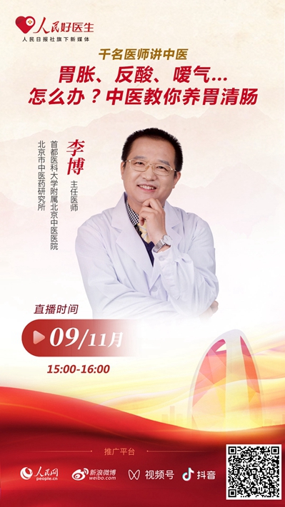 11月9日,“人民好醫生”與國家中醫藥管理局辦公室聯合推出的“千名醫師講中醫”系列直播將邀請北京市中醫研究所循證中心主任李博做客直播間,詳細講解中醫養胃方法。