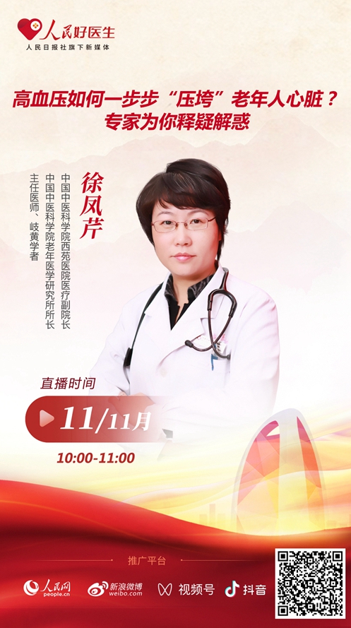 11月11日10:00,中國中醫(yī)科學院西苑醫(yī)院醫(yī)療副院長、中國中醫(yī)科學院老年醫(yī)學研究所所長、主任醫(yī)師、岐黃學者徐鳳芹將做客“人民好醫(yī)生”客戶端直播間,向廣大網友分享老年高血壓相關知識,歡迎屆時收看。