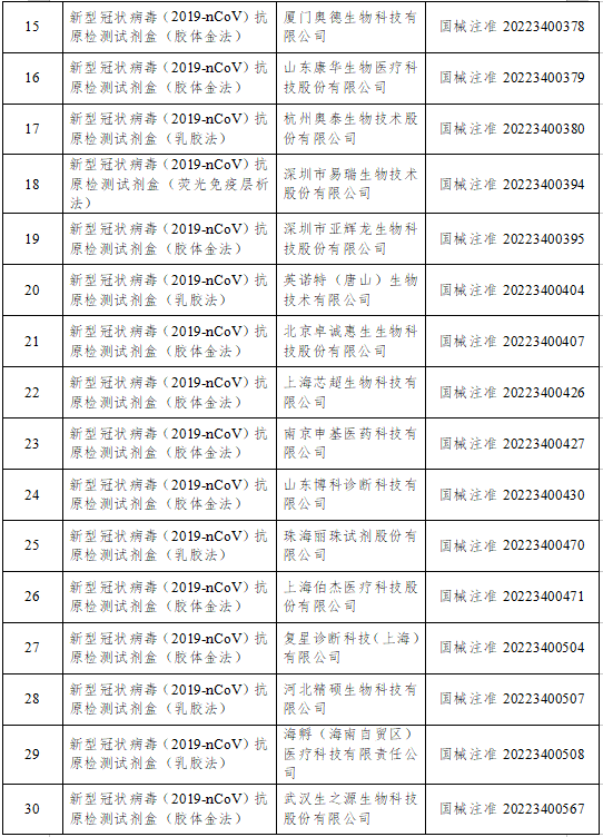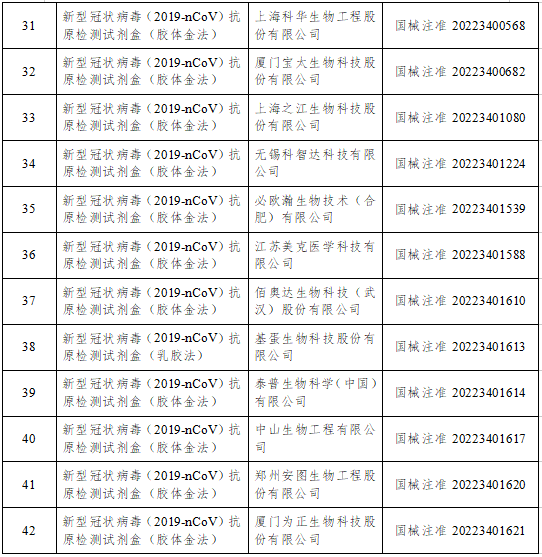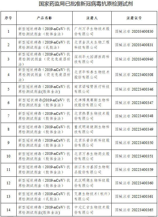 另外,12月9日,經國家藥監局審查,批準佰奧達生物科技(武漢)股份有限公司、基蛋生物科技股份有限公司和泰普生物科學(中國)有限公司3個企業的3個新冠病毒抗原檢測試劑產品。