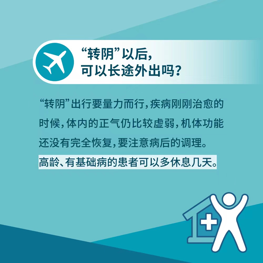 高齡、有基礎(chǔ)病的患者可以多休息幾天。雙節(jié)出行,要根據(jù)自身轉(zhuǎn)陰狀況定制計(jì)劃,量力而行。