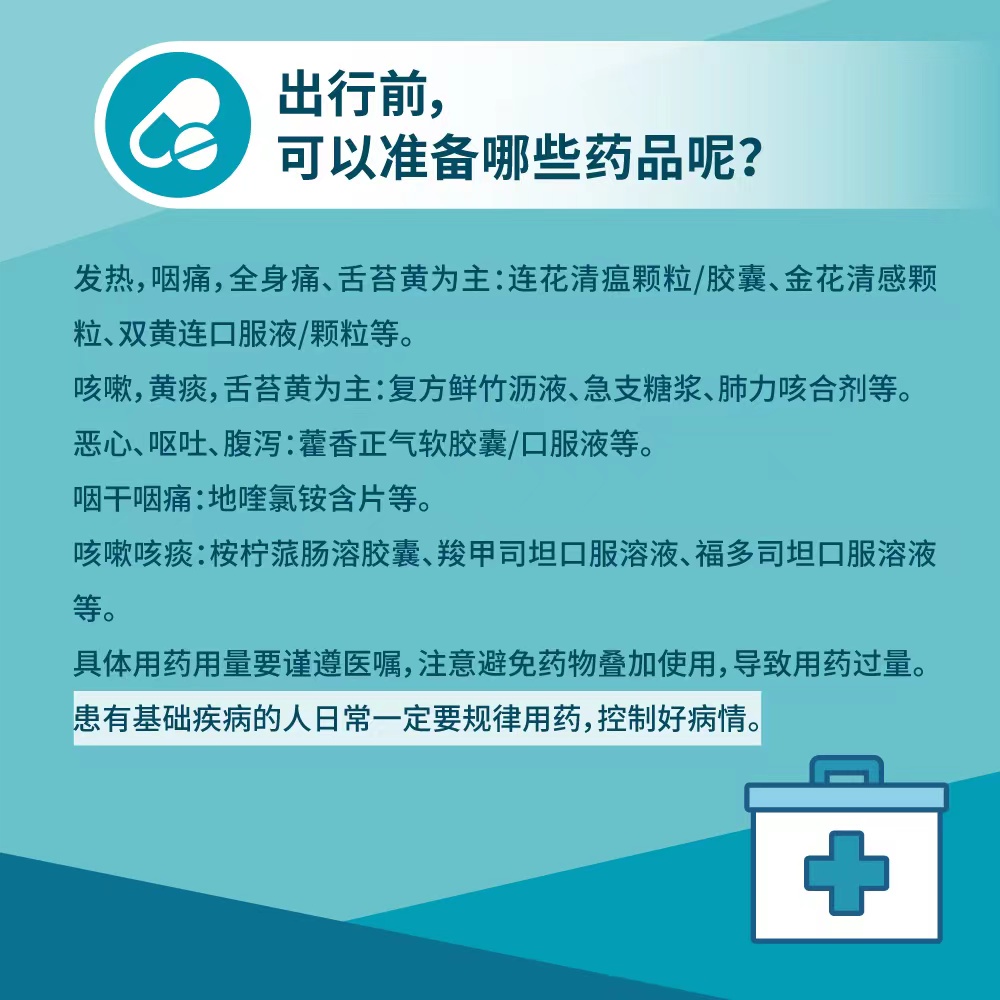 具體用藥用量要謹(jǐn)遵醫(yī)囑,注意避免藥物疊加使用,導(dǎo)致用藥過量。另外,患有基礎(chǔ)疾病的人日常一定要規(guī)律用藥,控制好病情,要根據(jù)出行周期準(zhǔn)備充足的基礎(chǔ)病用藥。