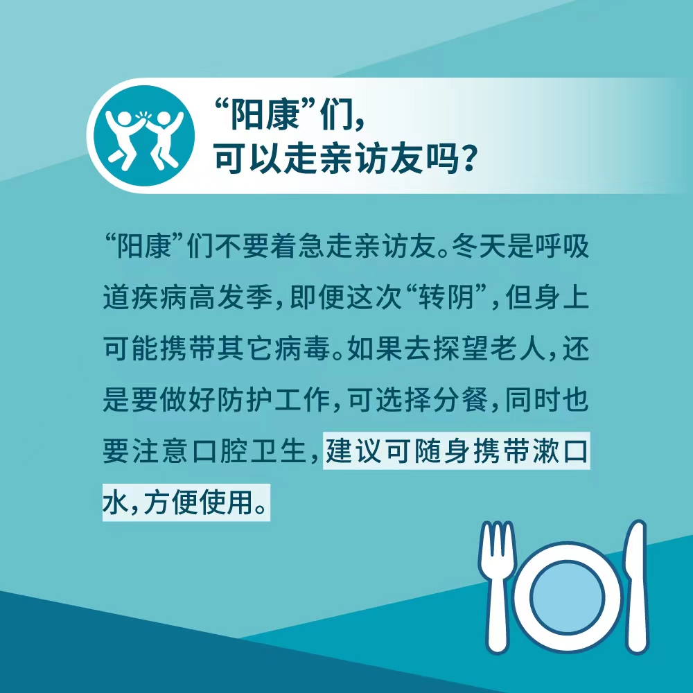 返鄉(xiāng)初期規(guī)范佩戴口罩,減少與家中老年人尤其是合并基礎(chǔ)性疾病者的接觸。已“陽康”的小輩不要著急探望家中老人。冬天是呼吸道疾病高發(fā)季,即便這次“轉(zhuǎn)陰”,但身上可能攜帶其它病毒,老年人很脆弱,如果去探望老人,還是要做好防護(hù)工作,比如戴好口罩、進(jìn)門洗手換衣服。在通風(fēng)的時(shí)候還是要保護(hù)好老人,為他們穿好外套、戴好帽子,防止著涼生病。可選擇分餐,盡量減少摘口罩飲食的時(shí)間。同時(shí)也要注意口腔衛(wèi)生,建議可隨身攜帶漱口水,方便使用。