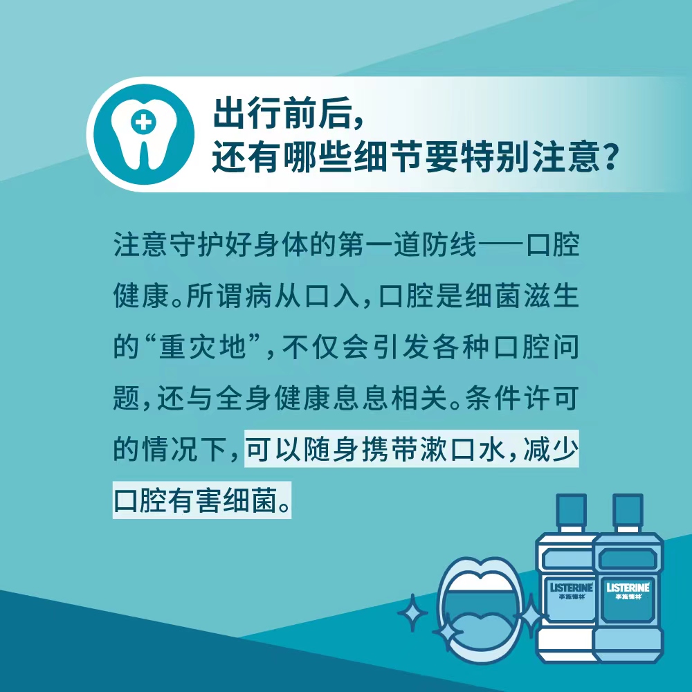 旅途期間,許多人生活作息紊亂,飲食不規(guī)律,容易導(dǎo)致身體免疫力下降。正所謂病從口入,大家更應(yīng)該守護(hù)好身體的第一道防線——口腔健康。口腔是細(xì)菌滋生的“重災(zāi)地”,口腔清潔不到位,不僅會(huì)引發(fā)各種口腔問題,還與全身健康息息相關(guān)。建議要養(yǎng)成科學(xué)的護(hù)齒習(xí)慣。條件許可的情況下,可以隨身攜帶漱口水,以利于減少唾液中的高濃度細(xì)菌,減少口腔有害細(xì)菌,預(yù)防牙齦及牙周問題,防止病從口入。