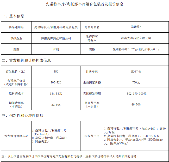 公示信息顯示,先諾特韋片/利托那韋片組合包裝的首發報價為750元/盒,含稅出廠價格(或進口到岸價格)為705-720元/盒,原料藥成本為334.53元,直接研發費用為502170000元。首發報價對照藥品包括奈瑪特韋片/利托那韋片(Paxlovid)、莫諾拉韋膠囊(利卓瑞)和阿茲夫定片。