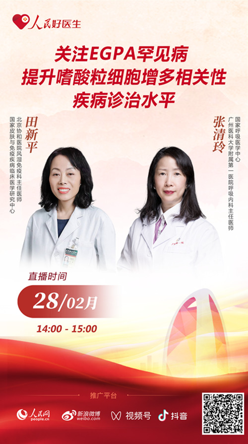 2月28日14:00,北京協和醫院風濕免疫科主任醫師、國家皮膚與免疫疾病臨床醫學研究中心田新平,廣州醫科大學附屬第一醫院呼吸內科主任醫師、國家呼吸醫學中心張清玲將做客人民日報社旗下新媒體平臺“人民好醫生”客戶端直播間,向廣大網友分享EGPA相關知識,歡迎屆時收看。