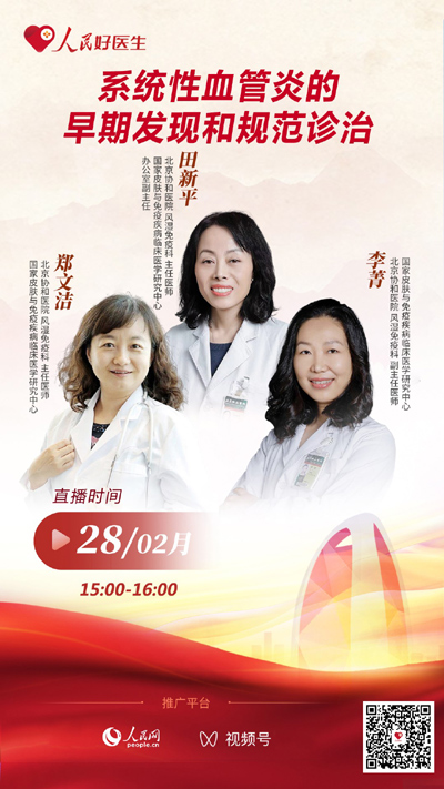 2月28日15:00,我們特別邀請到北京協(xié)和醫(yī)院風(fēng)濕免疫科、國家皮膚和免疫疾病臨床醫(yī)學(xué)研究中心田新平教授、鄭文潔教授和李菁副教授做客直播間,就“系統(tǒng)性血管炎早期識別和規(guī)范診治”的相關(guān)知識進(jìn)行科普。
