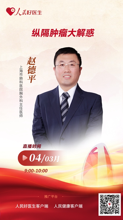 3月4日9:00至10:00,上海市肺科醫(yī)院胸外科主任醫(yī)師趙德平將做客“人民好醫(yī)生”客戶端,圍繞縱隔腫瘤相關(guān)問題進行交流分享,歡迎屆時收看。