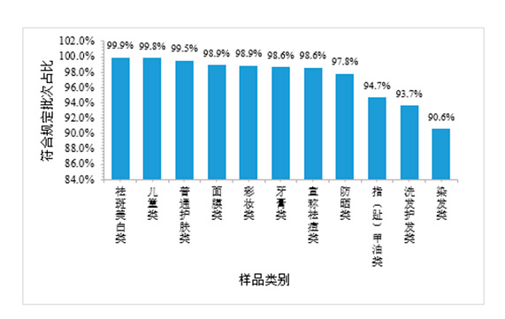檢驗情況顯示,在抽檢的11類化妝品中,祛斑美白類、兒童類、普通護膚類產品等8類化妝品抽檢符合規定批次占比均達到97%以上。