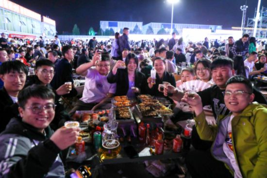 4月29日,游客在淄博市一家燒烤城吃燒烤。新華社發(朱偉攝)