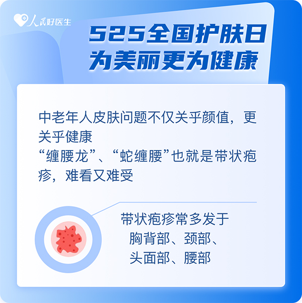 5月25日是全國護膚日,愛自己從愛護皮膚開始。而對于中老年人來說,皮膚問題不僅關乎顏值,更關乎健康。帶狀皰疹俗稱“纏腰龍”,除了會出現(xiàn)紅斑、丘皰疹、水皰等皮膚損傷癥狀外,還會伴隨劇烈疼痛,嚴重影響了中老年人的身體健康和日常生活。