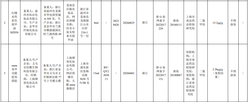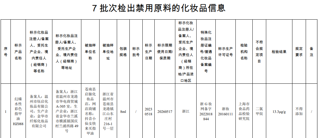根據通告,在2023年國家化妝品抽樣檢驗工作中,經上海市食品藥品檢驗研究院等單位檢驗,產品標簽標示委托方為溫州市鈺啟化妝品有限公司、受托生產企業為金華市纖爍化妝品有限公司生產的幻臻水性彩色指甲油HZ088等7批次化妝品不符合規定,檢出《化妝品安全技術規范(2015年版)》中規定的禁用原料。