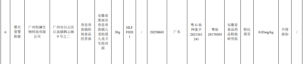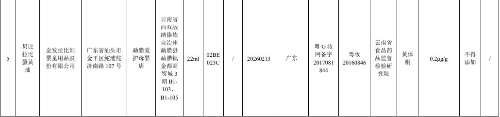 記者注意到,此次通報的7批次含禁用物質化妝品,其中2批次是嬰童產品。產品標簽標示為金發拉比婦嬰童用品股份有限公司生產的貝比拉比蛋黃油被檢出含有黃體酮;產品標簽標示為廣州恒瀾生物科技有限公司生產的嬰貝萱嬰膚霜被檢出含有特比萘芬。