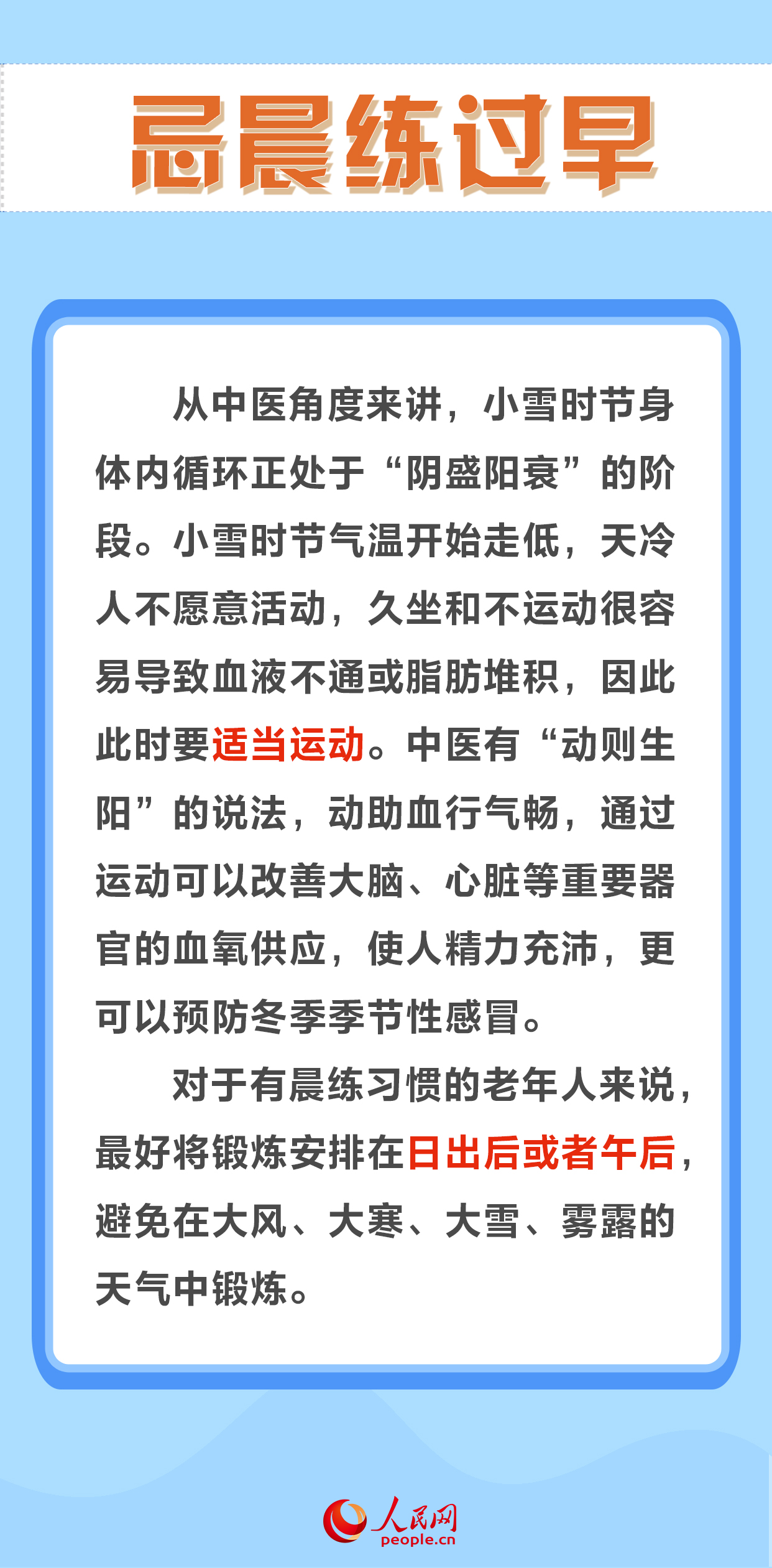 今日我們迎來小雪節氣。小雪,是二十四節氣中的第二十個節氣,也是冬季的第二個節氣。河南中醫藥大學第一附屬醫院主任醫師沈曉明在接受人民網記者采訪時表示,冬季氣溫驟降,防寒保暖不夠,人體易感受寒邪而為病;對于女性來講,更易遭受寒邪侵襲,導致氣血不暢,沖任虛寒等證;入冬后血液循環減緩,臟腑機能進入休養閉藏的狀態,人更容易受到抑郁情緒的影響。那么,此時我們該如何養生呢?沈曉明給出以下建議。