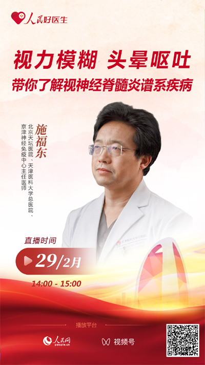 對于這種罕見的疾病,我們當前有哪些治療方法?如何進行預防?2024年2月29日14:00-15:00,“人民好醫(yī)生”客戶端將邀請北京天壇醫(yī)院、天津醫(yī)科大學總醫(yī)院、京津神經免疫中心主任醫(yī)師施福東來到演播室,就視神經脊髓炎譜系疾病的相關內容進行分享,歡迎您收看!