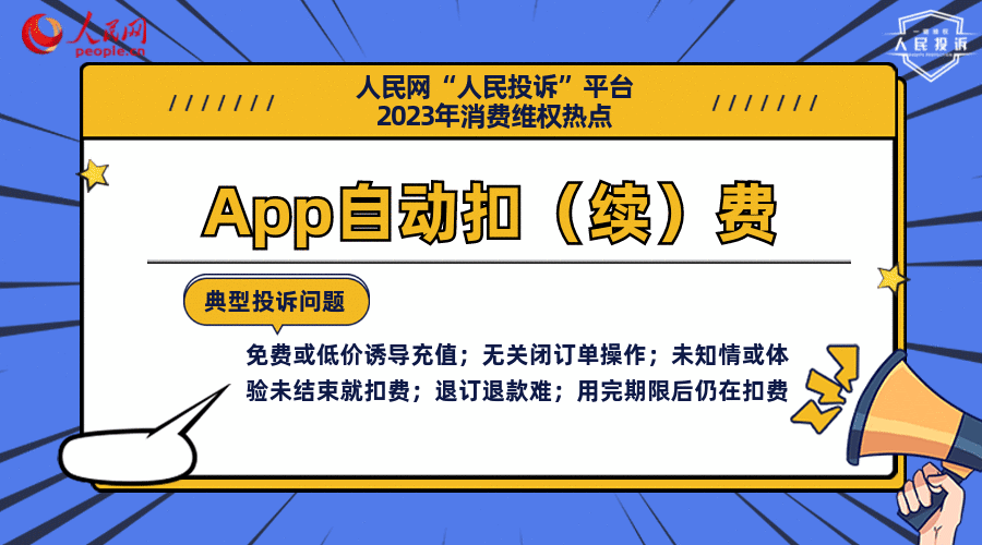 2023年以來(lái),“人民投訴”上,被投訴的App類別涉及工具類、休閑娛樂類、閱讀學(xué)習(xí)類、通信平臺(tái)類、生活服務(wù)類、游戲類、出行服務(wù)類等多個(gè)領(lǐng)域。“未收到提示,被直接扣除一年超級(jí)會(huì)員費(fèi)”“購(gòu)買了一年圖片使用權(quán),無(wú)按鈕或通道取消自動(dòng)扣費(fèi)服務(wù)”“點(diǎn)擊免費(fèi)試用卻被惡意扣費(fèi),平臺(tái)不退費(fèi)”“7天體驗(yàn)期未到,提前12小時(shí)自動(dòng)扣費(fèi)”“購(gòu)買1年會(huì)員并充值成功,商家以充值成功為由擅自開通自動(dòng)扣費(fèi)季度會(huì)員”“以1元試用默認(rèn)開通自動(dòng)續(xù)費(fèi)服務(wù),扣費(fèi)達(dá)20月”“購(gòu)買包月會(huì)員時(shí),沒有別的選項(xiàng)可以選擇,都帶著自動(dòng)續(xù)費(fèi)”“免費(fèi)七天VIP,在第六天就被取消了”“已經(jīng)卸載幾個(gè)月了,還在扣錢”等侵權(quán)行為令網(wǎng)友困擾不已。