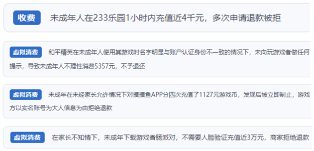 典型投訴問題:身份認(rèn)證成擺設(shè);大額高頻充值無(wú)提醒;平臺(tái)和游戲方惡意設(shè)置退款障礙、退費(fèi)額度不合理;防沉迷系統(tǒng)“失防”