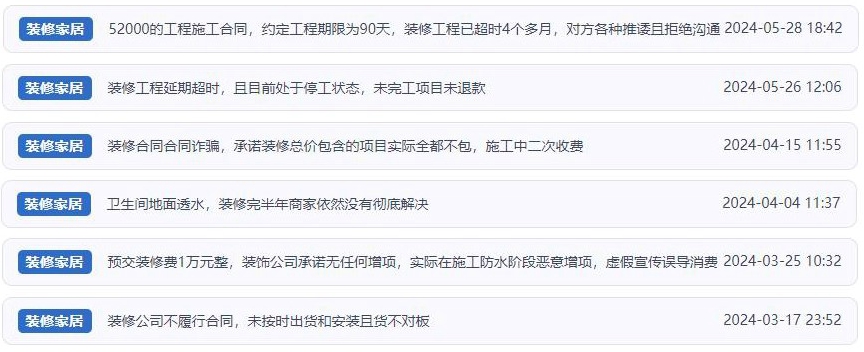 其實,有著同樣遭遇的消費者不在少數。公開報道顯示,今年以來有多個家裝機構分公司或經銷商跑路,還有個別不良裝修公司在短時間內聚收大量預付款后攜款跑路,給消費者帶來經濟財產損失。“人民投訴”梳理發現,除閉店跑路外,目前平臺上涉及家裝消費類的投訴問題多聚焦于——