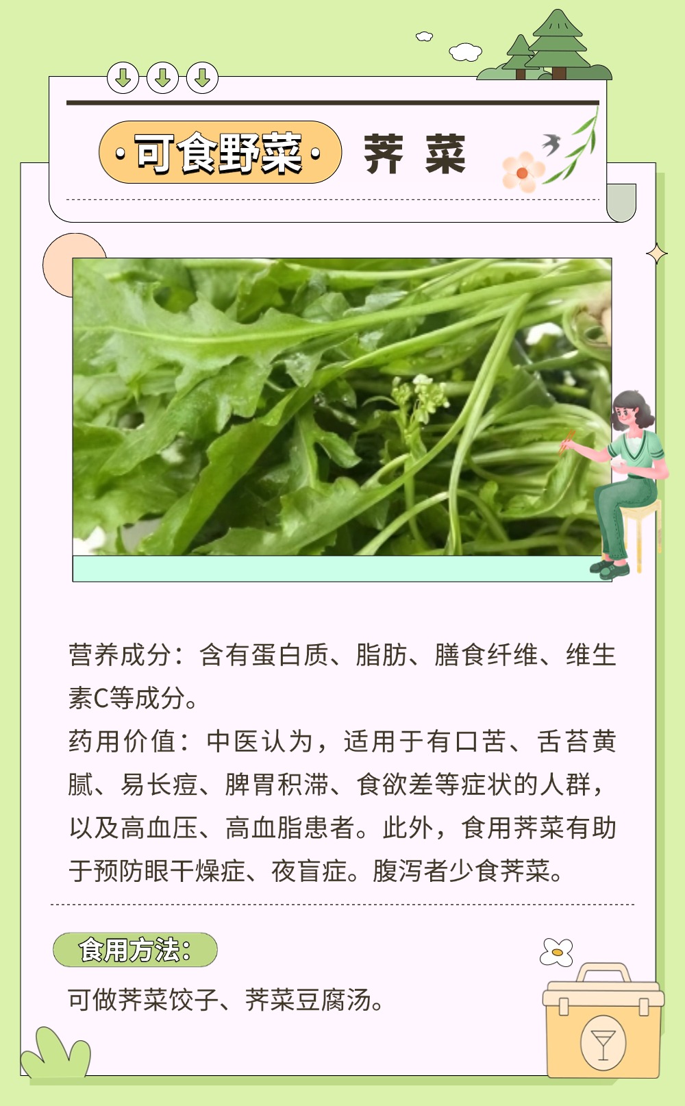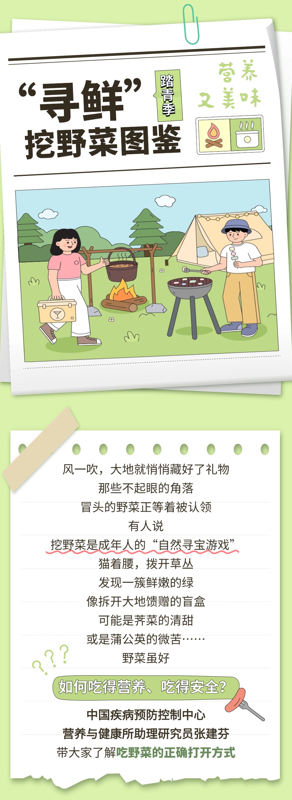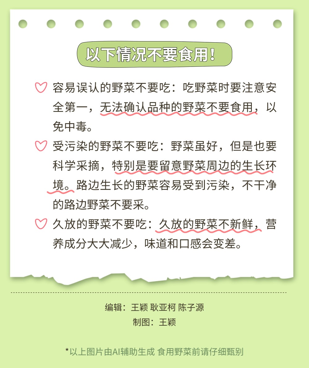 風一吹,大地就悄悄藏好了禮物。那些不起眼的角落,冒頭的野菜正等著被認領。有人說,挖野菜是成年人的“自然尋寶游戲”。貓著腰,撥開草叢,發現一簇鮮嫩的綠,像拆開大地饋贈的盲盒。如何將野菜吃得健康、吃得安全?一圖了解野菜的正確打開方式。