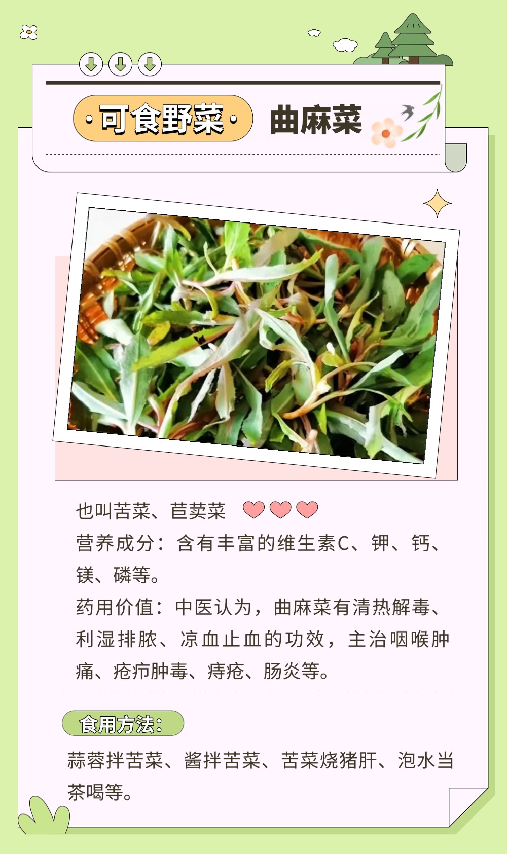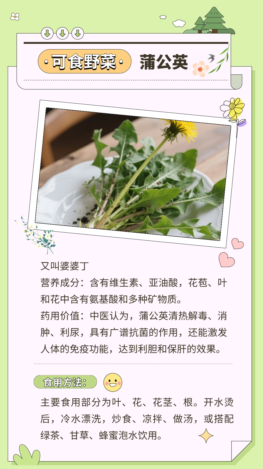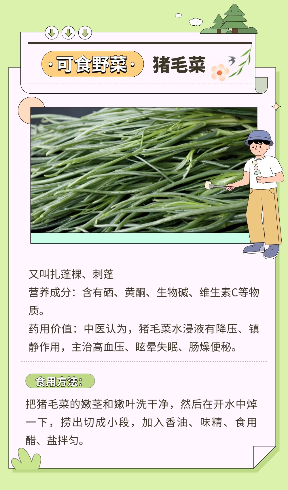 風一吹,大地就悄悄藏好了禮物。那些不起眼的角落,冒頭的野菜正等著被認領。有人說,挖野菜是成年人的“自然尋寶游戲”。貓著腰,撥開草叢,發現一簇鮮嫩的綠,像拆開大地饋贈的盲盒。如何將野菜吃得健康、吃得安全?一圖了解野菜的正確打開方式。